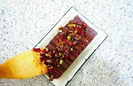 接著我們把已經炒好的調味品,均勻的淋在已經擺好盤子的鴨血上邊。