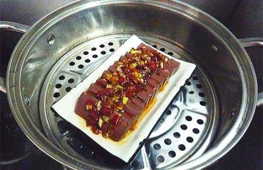 然後就可以上蒸鍋瞭,我們在鍋中放入適量的清水,大火燒開水上汽之後我們把已經擺好瞭調料的鴨血,放入鍋中用大火,蓋上鍋蓋,繼續蒸8分鐘就可以關火出鍋瞭。