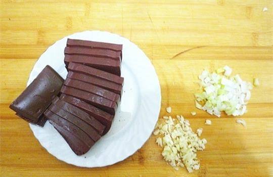 我們將所有的食材都準備好,然後將鴨血清洗幹凈,切成稍微厚一些的大片,然後將大蒜和蔥洗凈之後,分別切成末,放在一旁備用。