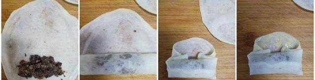 8.接下來我們包春卷。將自制紅豆餡放在春卷皮的底部,卷一下。