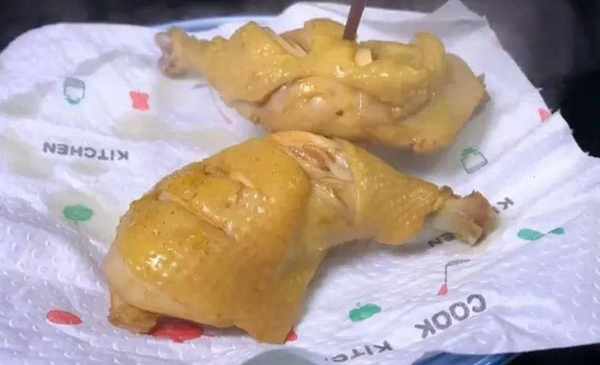 3、時間到瞭,煮好的雞腿用筷子就可以插進去,說明已經熟透瞭,然後控水撈出來,用廚房紙把雞腿表面的水分給它擦幹。
