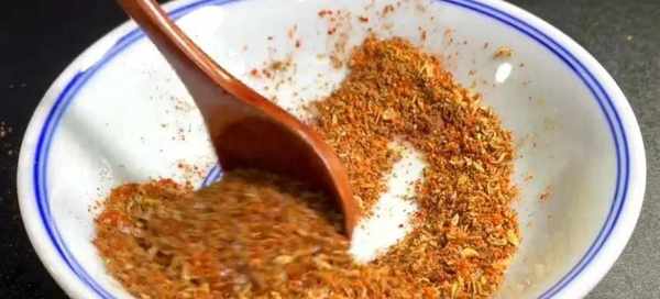4、做個炸雞腿的撒料,碗鍋裡加入多一些孜然,花椒,少許小茴香,開小火炒出香味,一直炒到顏色微黃香味。盛出來放在砧板上,然後用搟面杖把它搟碎。裝在小碗中,再加入一勺辣椒粉,食鹽,白糖,用勺子攪拌均勻,就做好瞭。