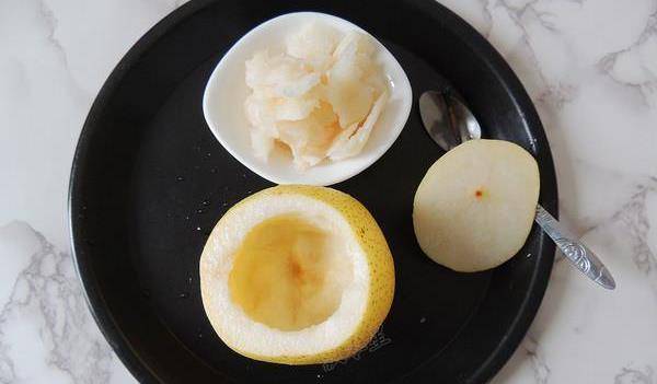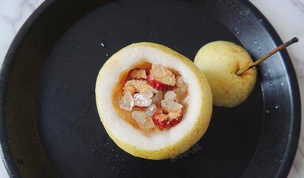 8.雪梨的表皮變深黃色,煮到梨肉變透明的時候,表示燉好瞭,請拿出來吃,雪梨和湯汁一起吃,有潤肺止咳的效果。