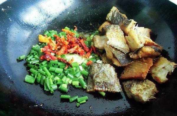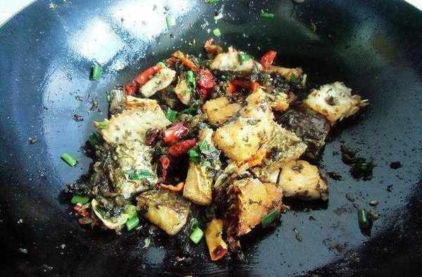 4、把魚塊撥在一邊,加蔥薑、辣皮子翻炒出香味