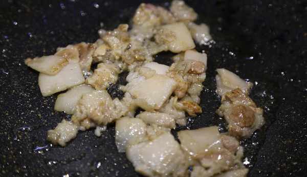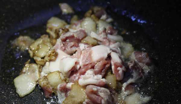 3、 鍋熱後放入肥肉煸炒,炒出裡面的油分,並把肥肉炒酥脆一些(如果肉不夠肥,鍋中可以先放少許油再煸)