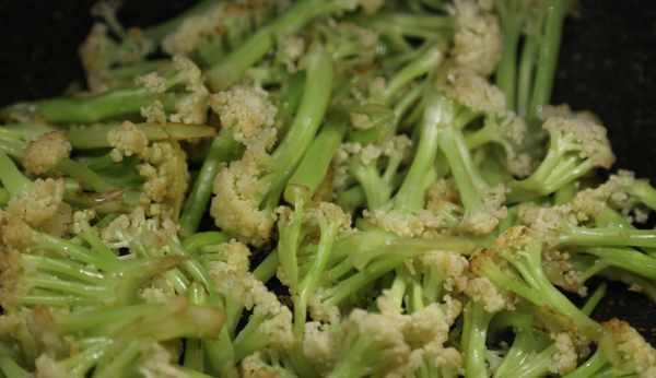 2、 鍋熱不放油把瀝幹水的菜花煸炒至菜花邊緣開始焦黃,盛出備用