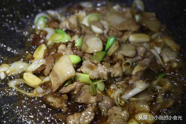 4、 放入略瘦些的五花肉炒變色後放入生抽及蔥、薑、蒜片翻炒