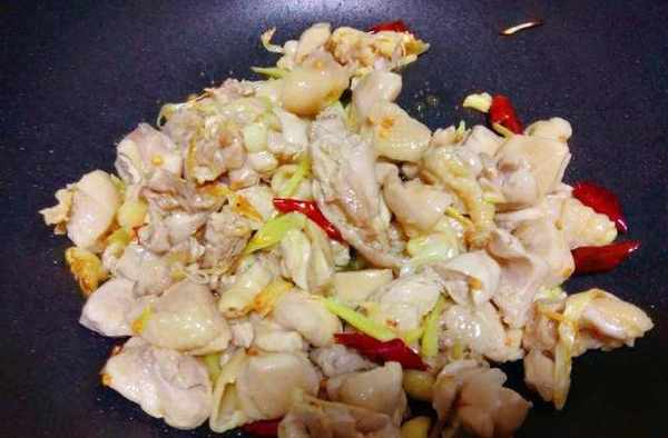 4、蔥薑蒜煸炒出香味後,放入沖洗幹凈的雞肉塊翻炒一會。