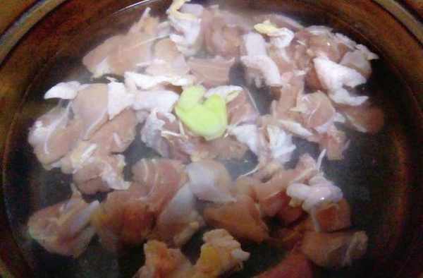 1、鍋裡備冷水,放入雞塊、生薑和料酒。