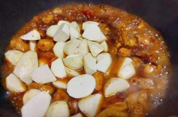 6、鍋裡加入適量的開水,水量剛剛瞞過雞肉就可以瞭,倒入切好的芋頭塊。