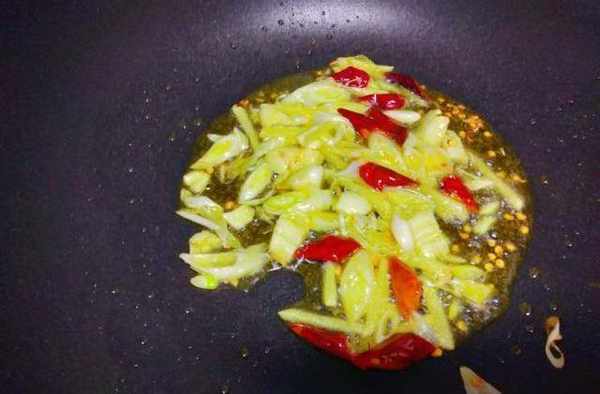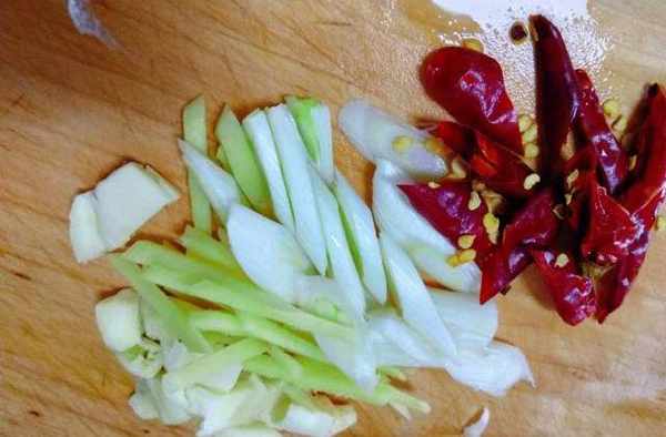 3、炒鍋裡備油(熱鍋冷油),放入切好的蔥、薑、蒜、幹辣椒煸炒。