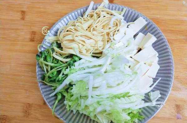 第4步,準備一塊嫩豆腐,切成小塊,豆腐皮切絲,豆芽洗凈,小白菜切絲,切點蔥花和生薑,在碗中磕入3~4個雞蛋,打散備用。