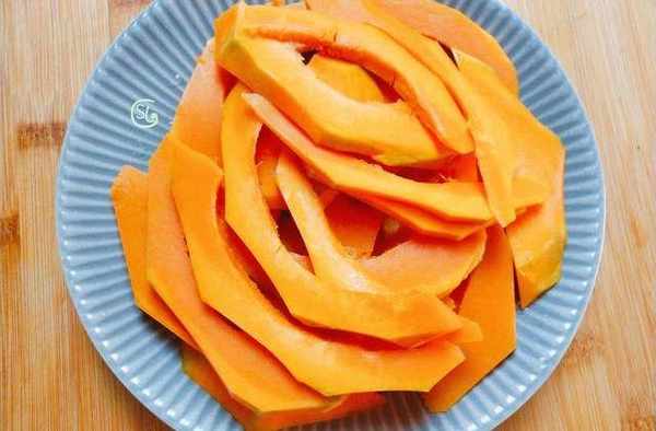 第1步,我們先準備一塊南瓜,南瓜去籽,去皮清洗幹凈之後,切成薄片狀,放進大盤子裡,上鍋蒸熟。