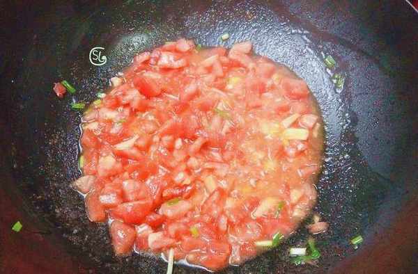 第6步,鍋中放入油,油熱之後加入蔥花,生薑炒香,再加入西紅柿,加入一點點食鹽,翻炒出西紅柿的湯汁。