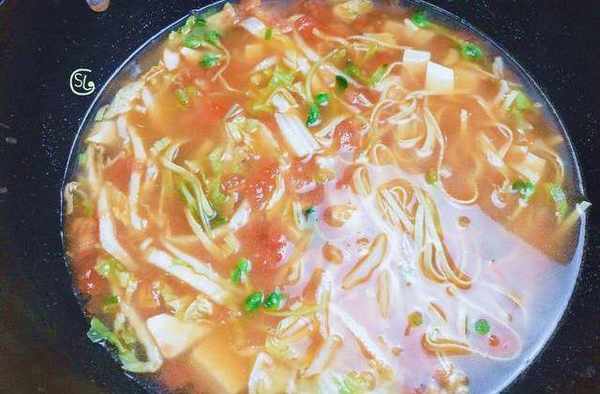 食材:南瓜,西紅柿,面粉,白菜,豆皮,豆芽,豆腐,蔥花,生薑,生抽,蠔油,雞精,食鹽,雞蛋。