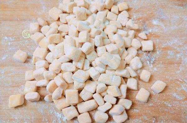 第5步,面團松弛好拿出來,放在案板上,直接搟成長方形,切成約0.5厘米的長條,然後再切成一厘米寬的小塊狀,切好瞭之後撒點幹面粉,抖散就形成一個個的小面球啦,也可以叫小面疙瘩。
