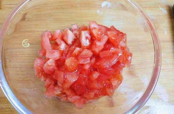 第3步,準備一個西紅柿,用小刀在西紅柿的表面刮幾下,揭掉西紅柿的皮,切成小塊狀。