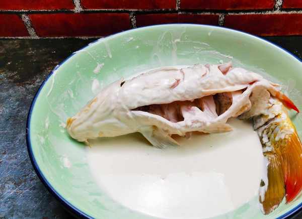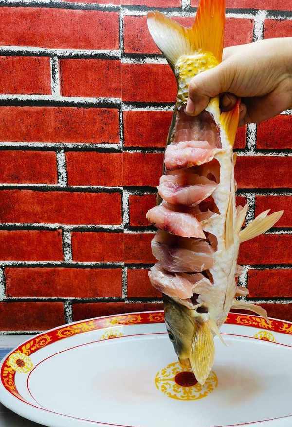 在這條大魚身上打瞭七個花刀,在下面打瞭八個花刀,叫“七上八下”。處理後的錦鯉要通透、自然外展、和諧美觀、大氣磅礴。將整條鯽魚放在一個盤子中,放上15克青蔥絲,10克薑絲,2克鹽,15克料酒,反復塗抹,去除異味,醃30分鐘。