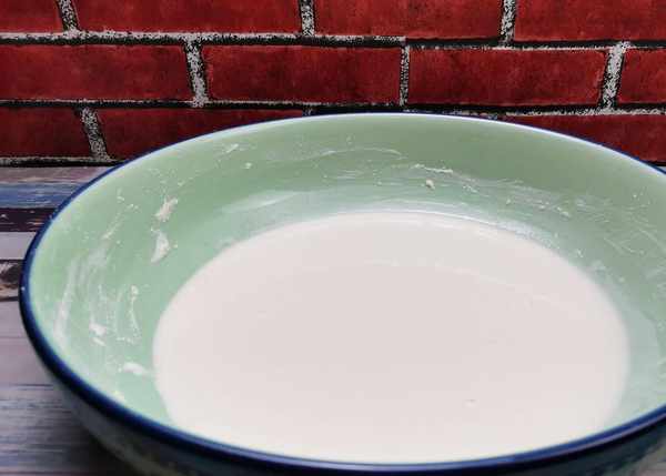 3、準備炸黃河鯽魚的粉漿:140克淀粉,60克面粉,放在一個比較大的盤子裡,這樣可以起鍋。首先加入130g左右的水,再加入30g左右的水,然後再加入適量的水,註意觀察情況,將混合好的水粉捏成一團,自然流動,這樣才能發揮出最好的效果。