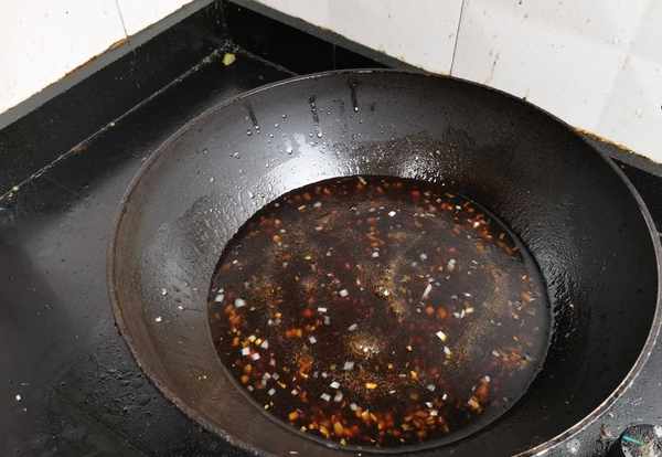 6、待鯉魚的色澤變淡,再開一口鍋,開始調制酸甜醬料。切蒜米,薑米,蔥花10 g,切成大米粒,切成均勻的形狀。從平底煎出大約30克的高油,放入蔥薑蒜煸香,倒入175克的米醋,翻炒至香味,倒入200克清水,200克細砂糖,5克鹽,再燒開後加入10克左右的黃豆醬油,調和糖醋味。