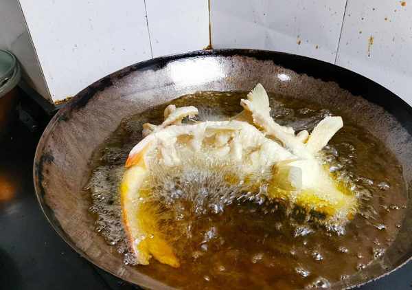 5、這時,鍋子裡的油溫已經接近七成,大約有兩百度,他拿起魚尾,在上面翻炒幾下,將魚皮切開。然後把魚肉倒在鍋裡,用中火慢慢煎,再用勺子舀一勺熱油。