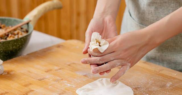 第七步:我們將餃子皮沾一些淀粉,用搟面杖將四周搟薄一些,最好是有波浪的花紋,然後再將已經趕好的面皮放到手上,中間用勺子填上糯米餡,放至湖口收緊就可以放置紗佈上,等上鍋蒸瞭。