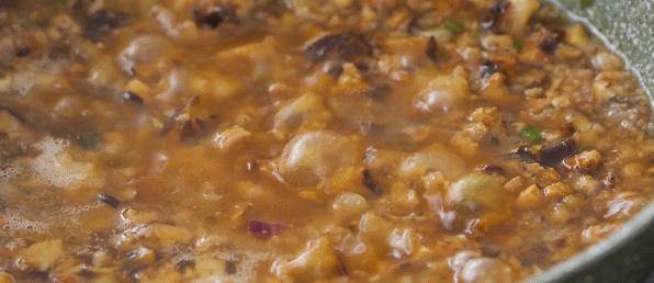 第六步:我們在繼續加入生抽,蠔油,老抽細砂糖還有食鹽進行調味,最後再將150ml的香菇水或者傢裡有骨頭湯的,就將香菇水不要放入,放入骨頭湯一起燉煮15分鐘,煮至他入味。最後再加入十克的胡椒粉,再將蒸好的糯米放到鍋中一起翻拌,翻拌均勻之後待用。