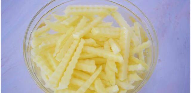 2、把土豆去皮洗幹凈,然後把土豆切成薄片,再用波刃切成狼牙條狀,放入水中洗掉多餘的淀粉,浸泡在水中。