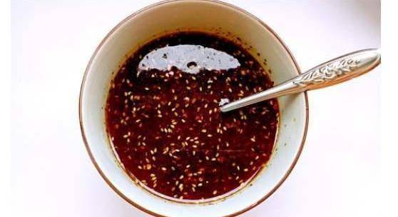 2.調制口水雞秘制醬料,準備一個小碗,加入兩勺辣椒油,兩勺醋,適量的鹽,一小勺香油,一勺生抽,適量糖,最後撒上帶有靈魂的芝麻,攪拌攪拌。吃薑蒜,香菜的朋友可以放點在醬料裡。