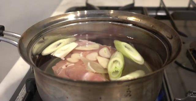 3.雞肉煮好以後在鍋裡燜十幾分鐘,再放入冰水中,這樣肉質會更嫩。