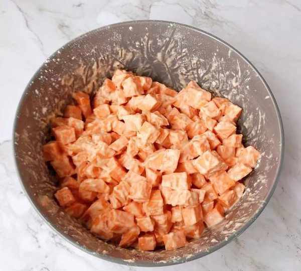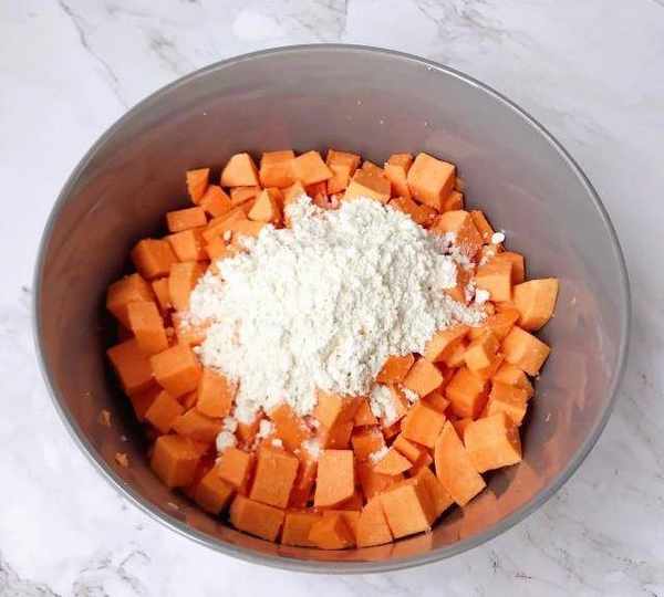 第6步、加水攪勻,面粉不宜過多或者過少,使每個紅薯丁都裹上面糊即可。