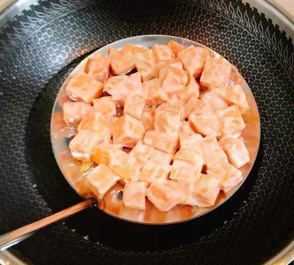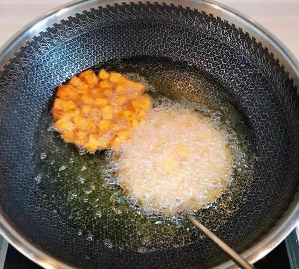 第8步、勺子上鋪滿紅薯丁,紅薯丁盡量挨的緊湊些,不然炸的時候會散。