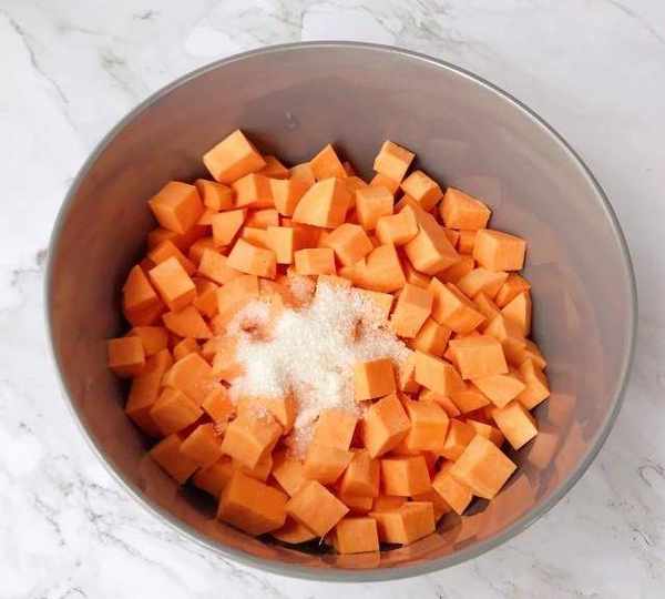 第4步、紅薯丁放大碗中,放入白糖,武漢的苕面窩(紅薯餅)是放鹽的,可以根據自傢口味,可咸可甜。