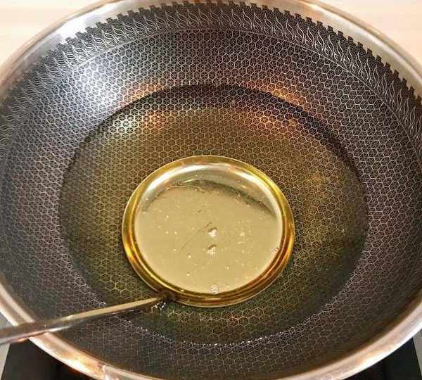 第7步、鍋中放油面窩勺子一起放入加熱,沒有面窩勺子用炒菜鏟子代替。