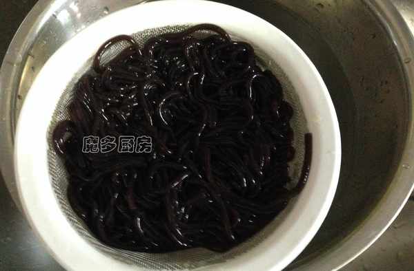 3、煮熟的蕨根粉在涼水裡過一下再撈出瀝水;