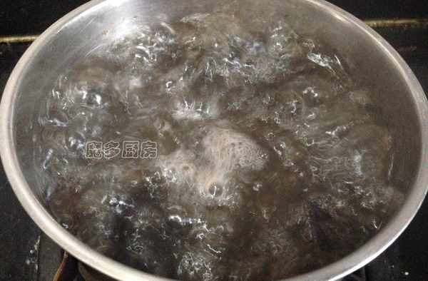 2、鍋裡燒開水,把蕨根粉放進去煮軟;
