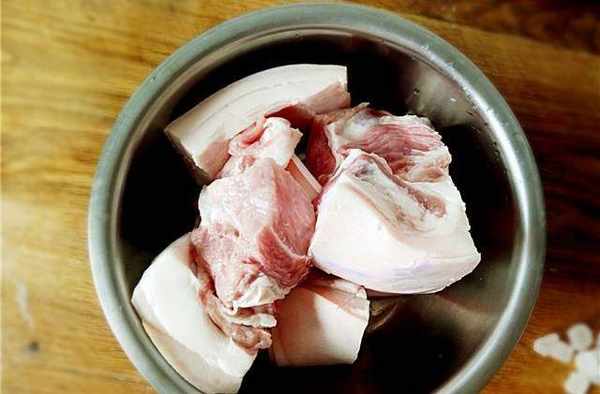 將帶皮五花肉洗凈切大塊,放入涼水中燒開煮2分鐘左右,清血水去異味。