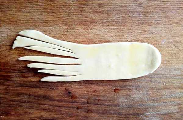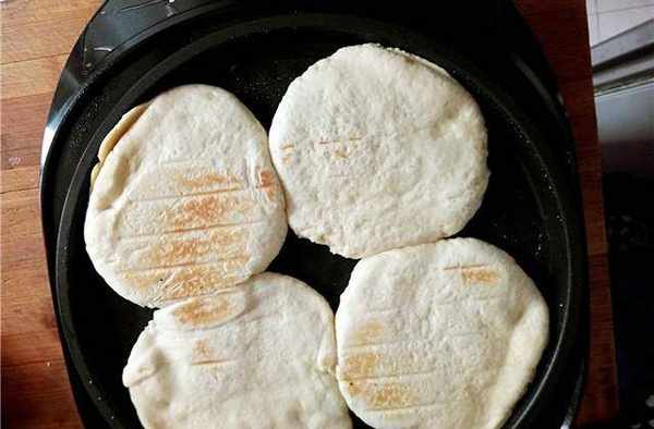 將面劑子搓條,搟成長片,抹上酥油(就是將熱油澆在面粉裡,攪拌均勻),尾端用刀劃出細條,從一端卷起,用手弄成團,搟開成餅胚。