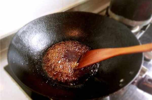炒糖色。熱鍋加入少許油,將白糖炒至大泡變小泡的瞬間,加入一大勺開水,糖色呈琥珀色即可。(切記全程用中小火,防止飛濺)