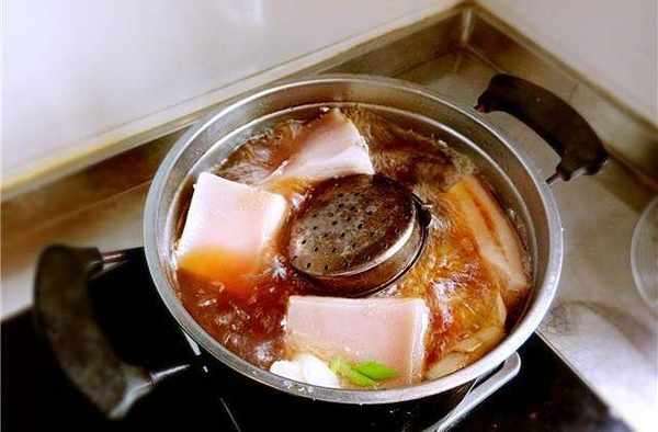 燒大半鍋水(一次加夠,煮肉中途不再加水),加入肉塊,倒入糖色,下入料包,再按1:3:2的比例調入老抽、生抽和耗油,最後加入冰糖和鹽。