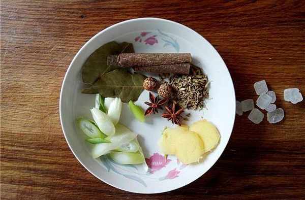 準備好鹵肉用的香葉、八角、小茴香、桂皮、花椒、生薑、大蔥等調料。