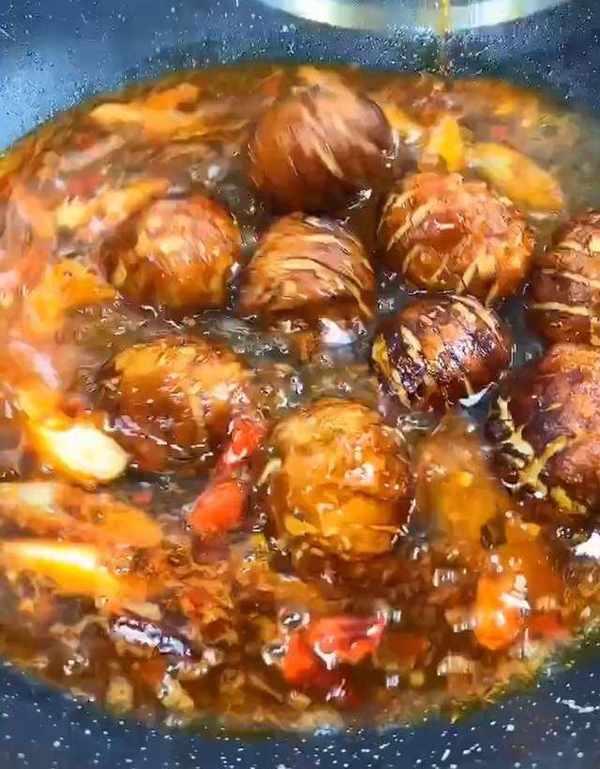 3、鍋底留油,放入火鍋底料,豆瓣醬,蔥薑幹辣椒煸炒出香味兒,倒入一罐啤酒,然後下入炸好的雞蛋燉煮。