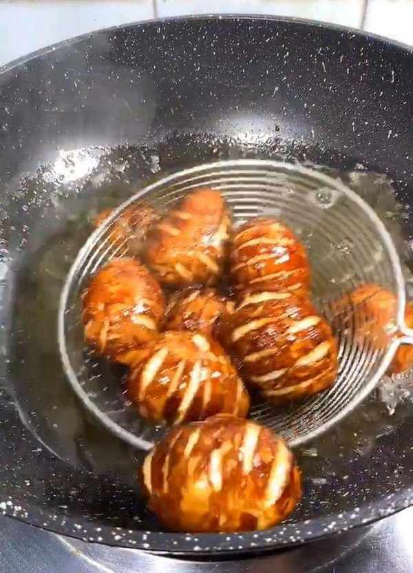 2、起鍋燒油,油溫六成熱,將上好色的雞蛋下鍋炸至虎皮色撈出備用。