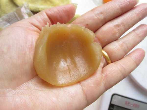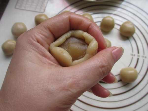 第六步:把小劑子按扁,放上餡料,用虎口慢慢的收口,團成圓球,用月餅模具壓出。