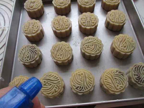 第七步:全部壓好以後,用噴壺噴上一層清水,放入烤箱200度烤5分鐘定型,然後拿出刷上蛋液,再入烤箱180度20分鐘即成。