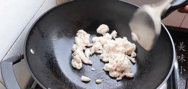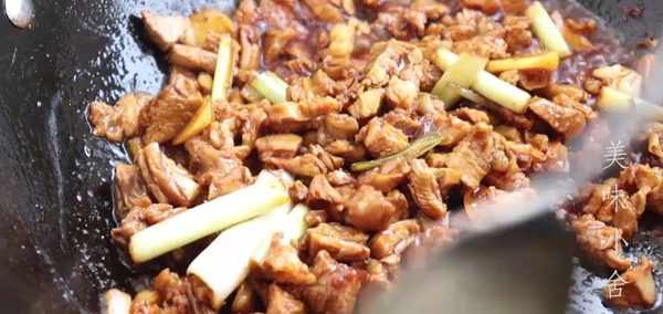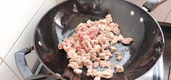 炒至肉顏色發白的時候放入蔥段和生薑片
