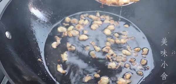 慢慢的羊油就完全炸出來瞭,等裡面炸的剩下渣的時候,把肉渣撈出來
