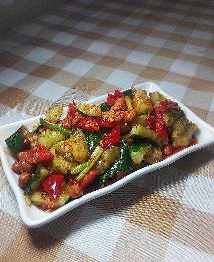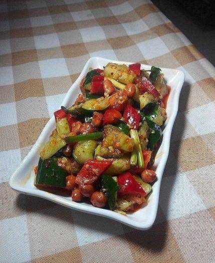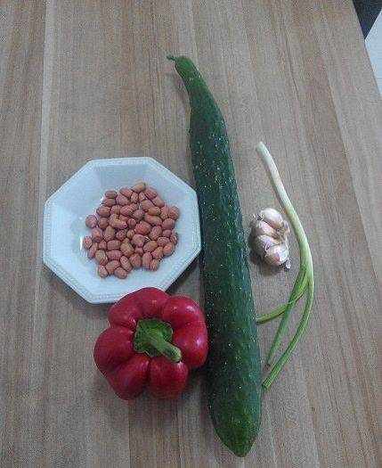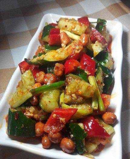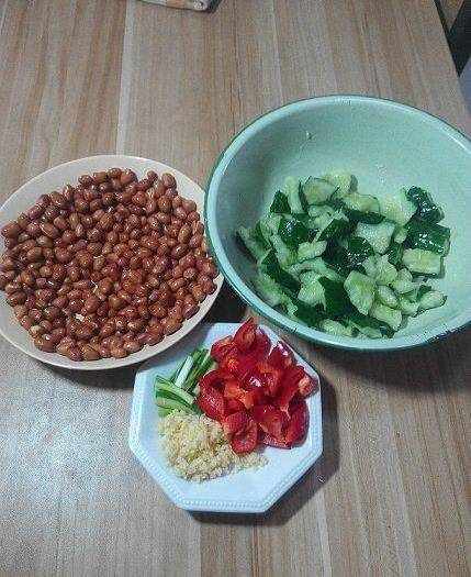 把花生米,甜椒,蒜末,蔥段,適量雞精,少量白糖(吃不出甜味為準),生抽,香醋(吃不出酸味為準),多點紅油辣椒,適量花椒粉(油),喜歡香油可以適當滴點兒,拌勻拌勻。