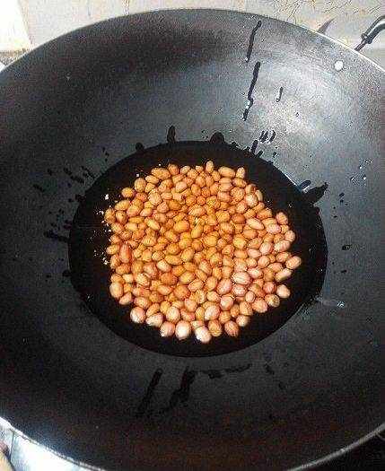 先把花生米冷鍋冷油下鍋開小火慢慢酥透,撈出放涼備用。具體怎麼酥花生米,老醋花生那篇已經講過,這裡就不重復瞭。
