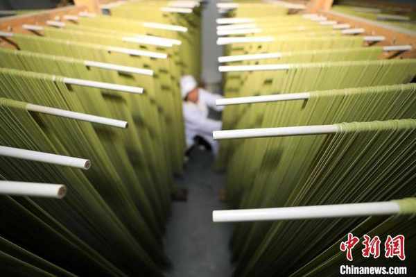 貴州省江口縣雙江街道一傢食品加工企業加工的抹茶面條。 李鶴 攝
